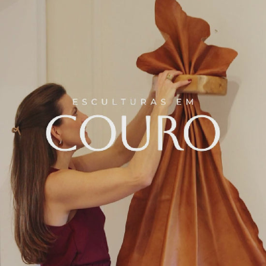 Uma obra que se desdobra como um sopro do tempo sobre a matéria viva. Dobras da Terra é uma escultura em couro natural moldado à mão que evoca o gesto delicado de uma dobra orgânica — entre folha, pele e paisagem. A madeira esférica, no centro da composição, atua como um eixo silencioso, tensionando o movimento da peça com poesia e força.