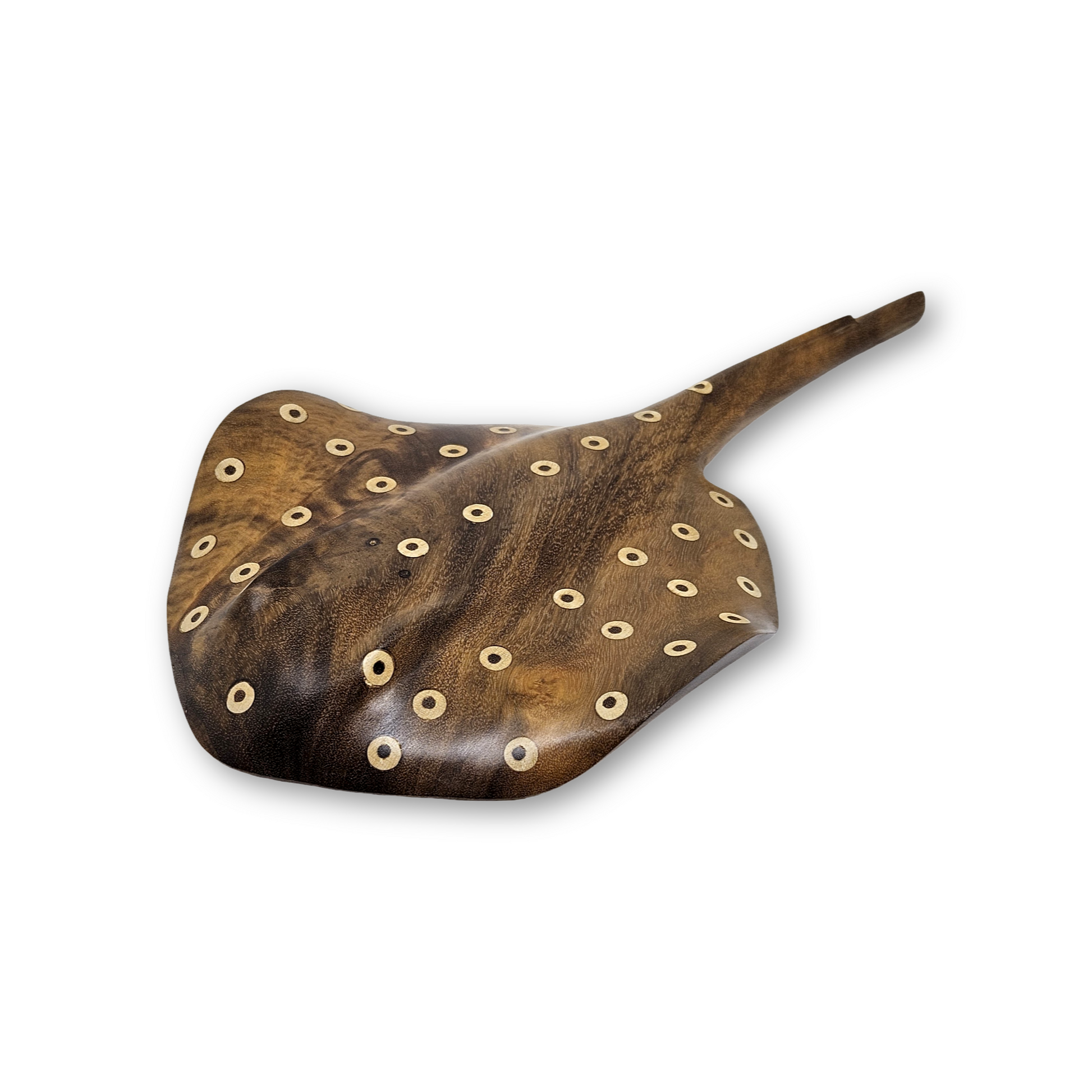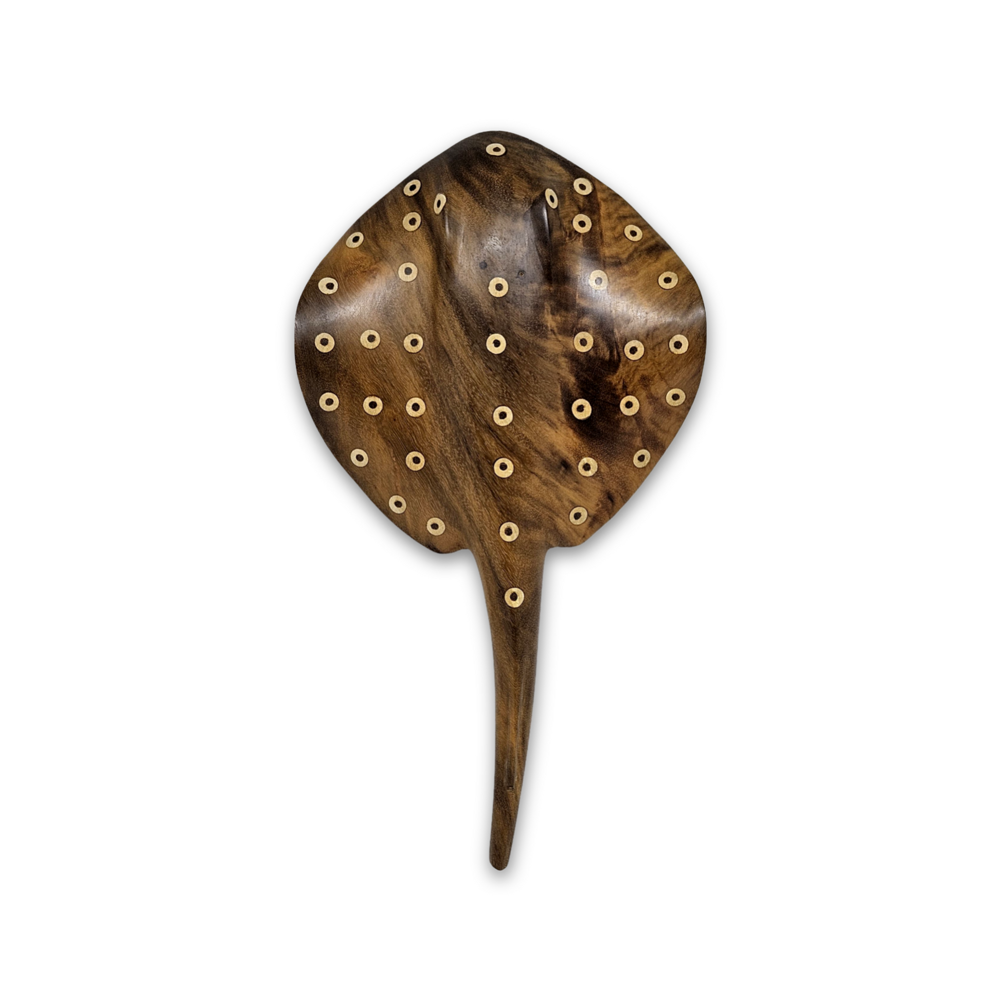 Inspirada na fauna aquática da Amazônia e na conexão ancestral dos povos indígenas com os rios de água doce, a Arraia de Madeira Baré é uma escultura artesanal feita à mão por artesãos indígenas, com reaproveitamento sustentável de madeiras nobres caídas naturalmente na floresta.