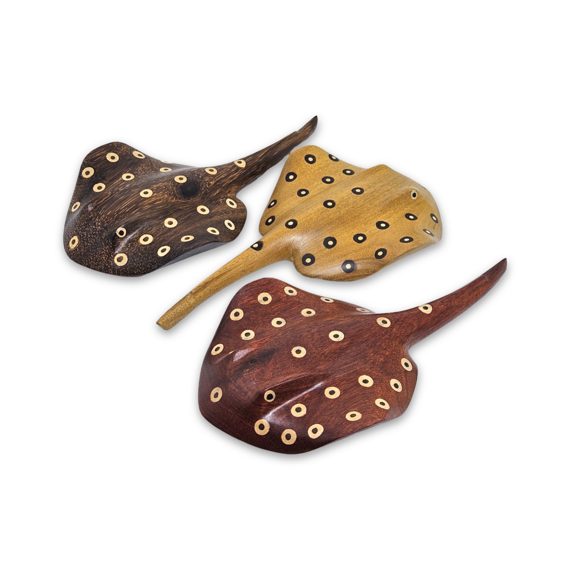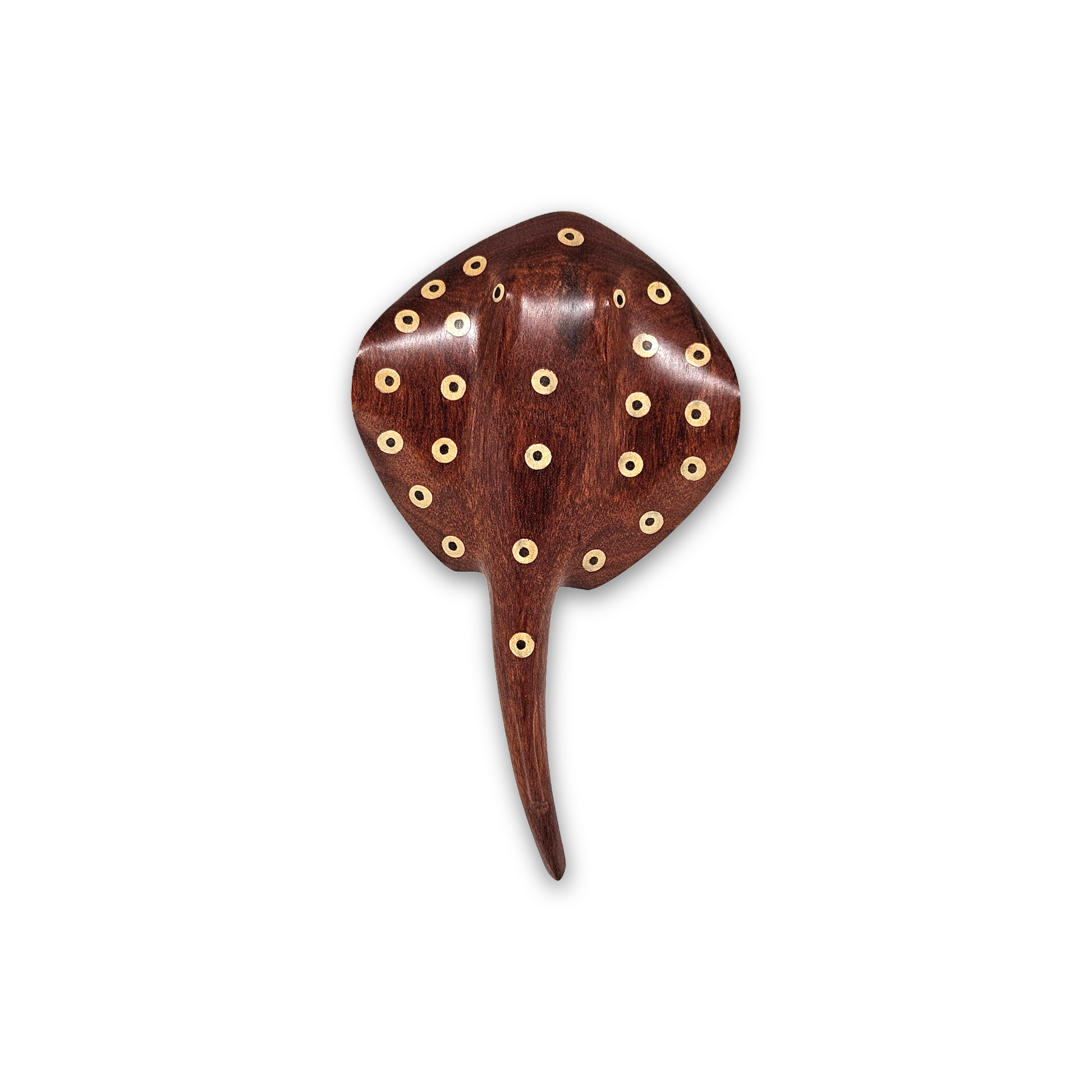 Inspirada na fauna aquática da Amazônia e na conexão ancestral dos povos indígenas com os rios de água doce, a Arraia de Madeira Baré é uma escultura artesanal feita à mão por artesões indígenas, com reaproveitamento sustentável de madeiras nobres caídas naturalmente na floresta.